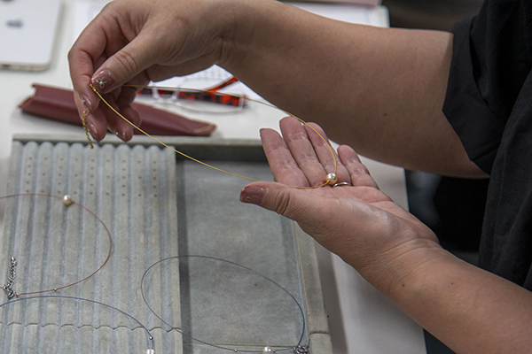 今回は販売会と同時にアクセサリーづくり体験を開催します。実際にアコヤ貝から真珠を取り出し、孔開け機で孔を開けて、ネックレスを製作します。一粒の真珠にカラーワイヤーを通したシンプルなタイプです。普段できない体験をしていただき、真珠についての知識や裏話などもお楽しみいただけます。